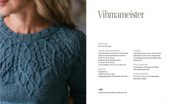 - Mustrid on peamiselt jämedamale lõngale, nii valmivad kudumid kiiresti. Kudumite juhendid on suurustele XS–XXL, et igale kehatüübile leiduks sobiv.